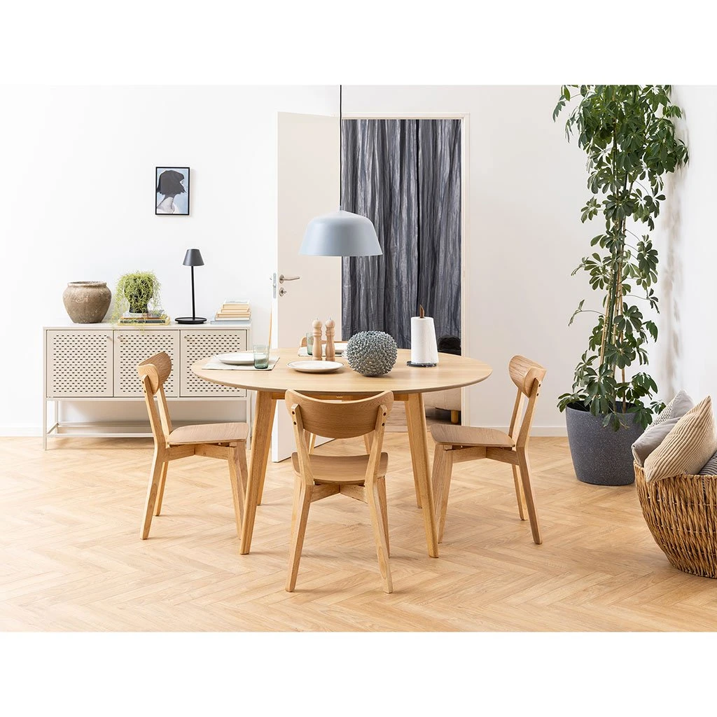 Placage chêne chêne, piètement chêne teinté mat hévéa laqué AC.