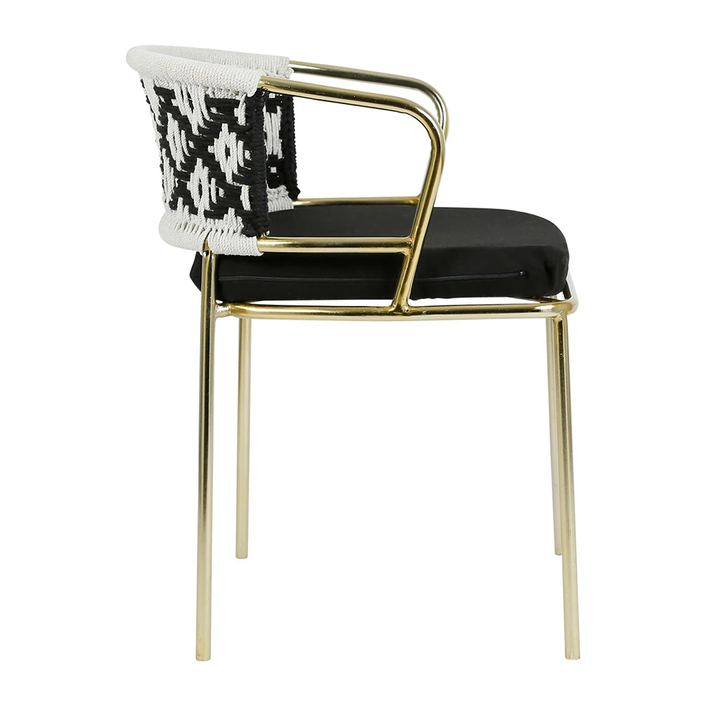 Conçu avec un cadre en fer robuste et une finition dorée, ce fauteuil chic offre un confort infini dans son assise moelleuse en coton noir.