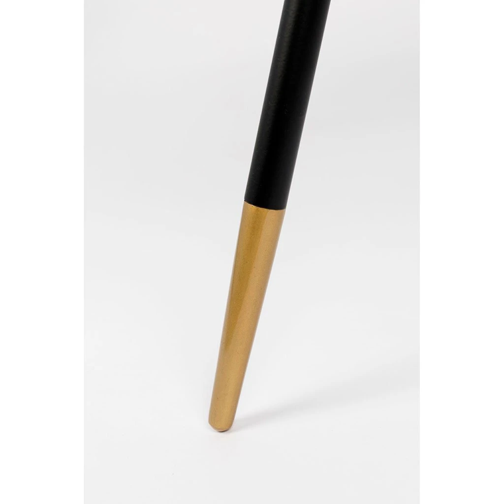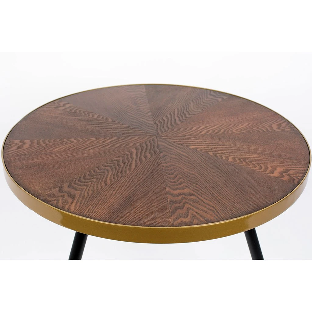 Plateau de table en MDF avec placage en bois de frêne finition couleur noyer (teinté et laqué) et bord en fer peint or. Pieds enduits de poudre noire avec pieds peints en or sur capuchons en plastique